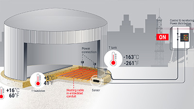 凍脹防護系統可防止低溫儲罐地面下形成冰體。冰體形成會導致許多問題,例如不必要或失控的儲罐移動或升高。可通過在低溫儲罐周圍應用保溫層,和通過將電伴熱線應用到儲罐下面的混凝土層,來防止凍脹